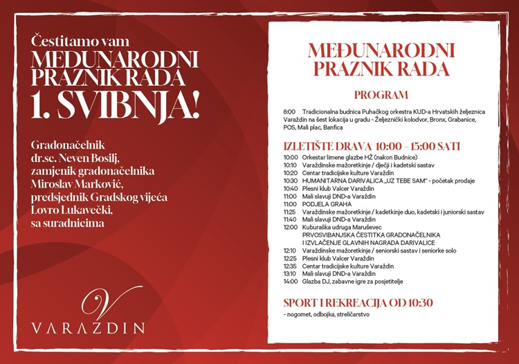 Varaždin i ove godine potvrđuje status grada koji uspješno spaja tradiciju, kvalitetan javni program i društvenu odgovornost te poziva građane i posjetitelje da se pridruže proslavi Praznika rada na Dravi i uživaju u programu ispunjenom glazbom, sportom, druženjem i solidarnošću.