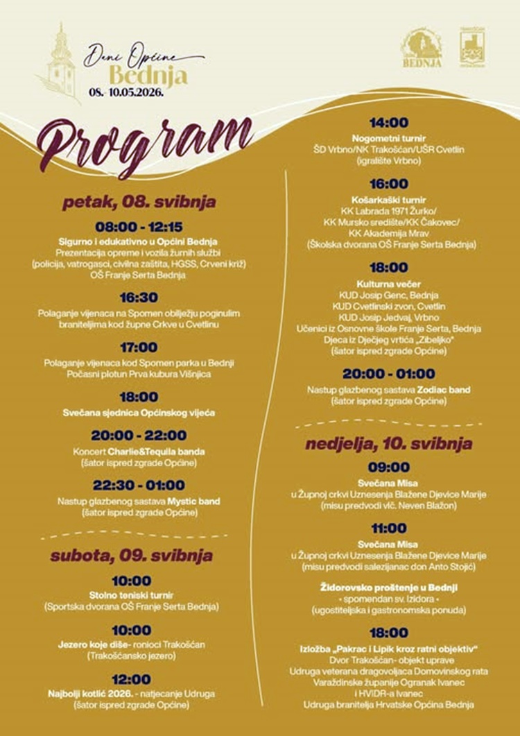 - Dani Općine Bednja prilika su da se osvrnemo na postignuto, ali i da zajedno obilježimo vrijednosti koje nas povezuju. Pripremili smo program koji obuhvaća sport, kulturu, edukaciju i duhovni sadržaj, kako bi svatko mogao pronaći nešto za sebe. Posebno mi je drago što u program uključujemo djecu, udruge i brojne sudionike iz različitih područja. Vjerujem da će i ove godine Bednja biti mjesto susreta, dobre atmosfere i ugodnog druženja. Pozivam sve da nam se pridruže i budu dio obilježavanja Dana naše općine – poručio je načelnik Poljak.