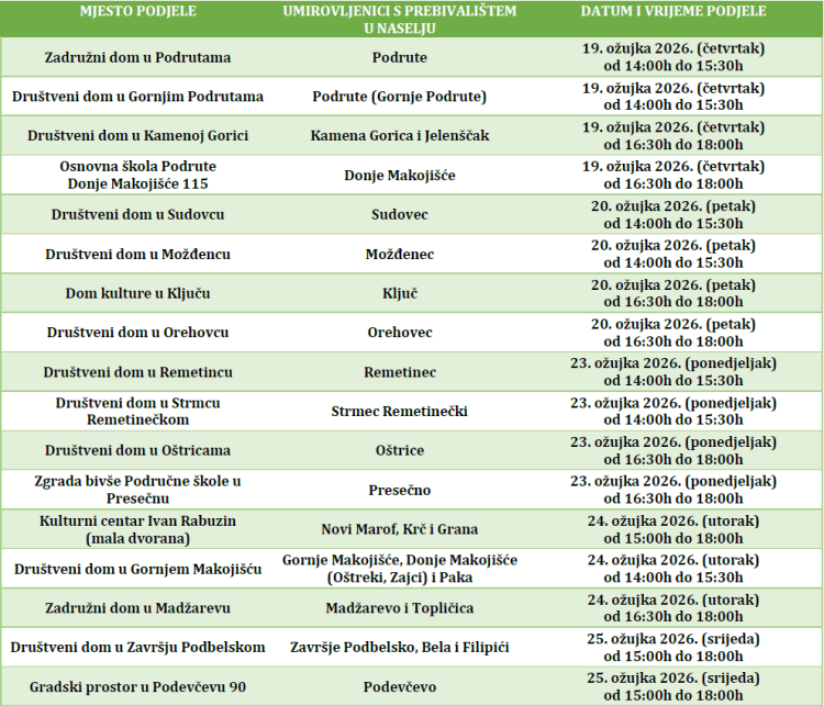 Podjela uskrsnica održat će se u periodu od 19. do 20. ožujka te od 23. do 25. ožujka na više lokacija na području grada. Umirovljenici koji neće moći preuzeti uskrsnicu u terminu predviđenom prema mjestu prebivališta, uskrsnicu će moći podići 26. i 27. ožujka 2026. godine od 8 do 14 sati u prostorijama Grada Novog Marofa.