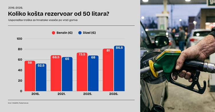 Za vozače koji toče benzin, punjenje istog rezervoara danas iznosi oko 81 euro, naspram 73,50 eura lani i 58 prije 10 godina. U tom razdoblju povećao se standard hrvatskih građana, ali on je praćen i konstantnim rastom cijena.