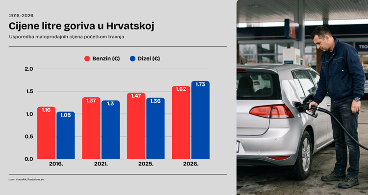 Početkom travnja 2026. litra dizela stoji 1,73 eura, a litra benzina 1,62 eura; takve cijene još nisu na razini rekordnih iz 2022. koje su bile potaknute ratom u Ukrajini, no građani bi svejedno mogli osjetiti razliku u svojem budžetu.