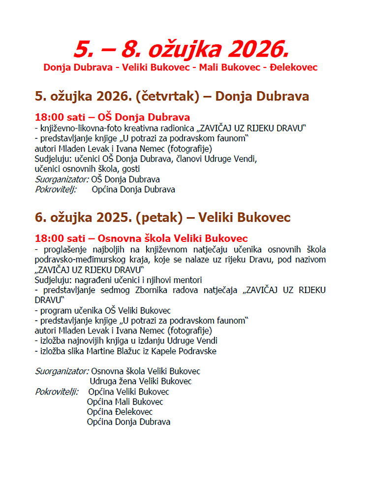 Dan kasnije, u Velikom Bukovcu, bit će proglašeni najbolji radovi učenika osnovnih škola s područja uz rijeku Dravu u sklopu književnog natječaja „Zavičaj uz rijeku Dravu“, uz predstavljanje sedmog Zbornika radova i bogat program učenika.