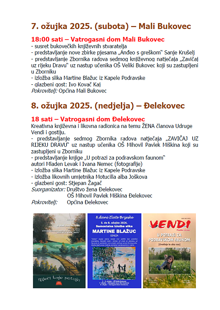 Program u Malom Bukovcu održat će se u subotu, 7. ožujka od 18 sati u Vatrogasnom domu. Upriličit će se susret bukovečkih književnih stvaratelja te prvo predstavljanje nove zbirke pjesama „Anđeo s greškom” autorice Sanje Krušelj.