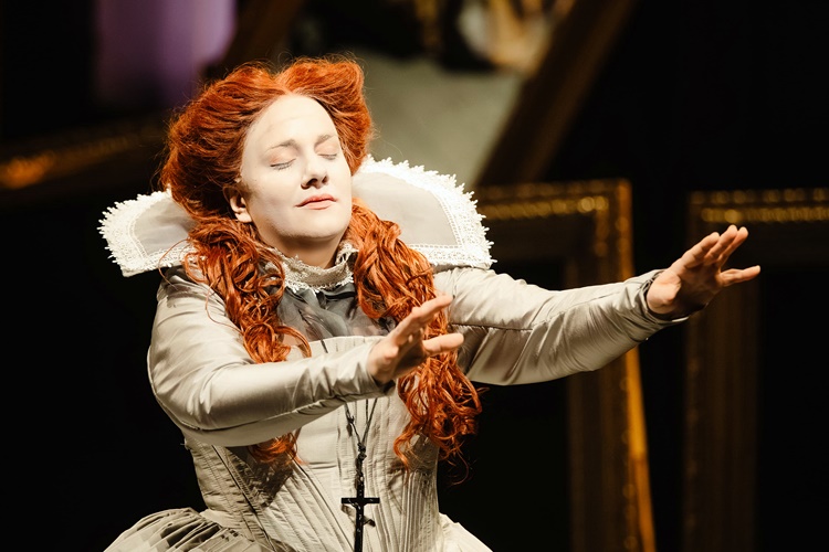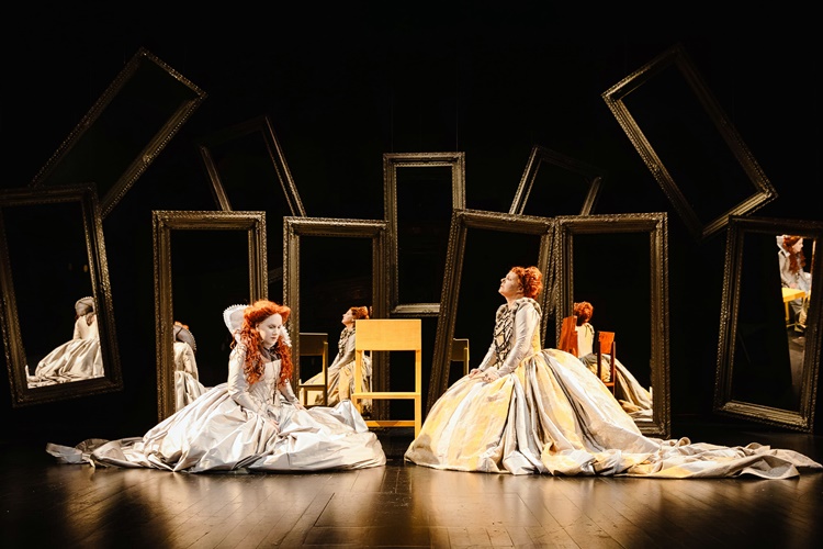 U režiji i dramaturgiji Marina Blaževića fokus je usmjeren na karakterni kontrapunkt, dramski sukob i čuvenu scenu konfrontacije dviju kraljica. Njihove nasuprotne osobnosti i životne situacije, kao i intenzitet njihova konflikta potenciraju raskošni kostimi ekstremnih dimenzija u kreaciji Sandre Dekanić. U našoj predstavi dvije kraljice (engleska i škotska), odnosno dvije žene sučeljene u borbi za vlast, svoja uvjerenja, ali i za ljubav istog muškarca, smještene su u prostor koji bi se mogao opisati kao kazališni kaleidoskop: u brojnim ogledalima postavljenim uokolo pozornice udvajaju se i nadalje multipliciraju, preklapaju i prelamaju, spajaju i razdvajaju zrcalni odrazi ne samo fizičkih pojava nego i doživljajnih odnosno izražajnih reakcija, misli i stavova dviju ujedno fatalno povezanih i razdvojenih, paradoksalno srodnih i raznoronih, upravo kobnih - dvojnica, sestara - koje to nisu mogle niti smjele biti. Tu nepodnošljivu udaljenost u bliskosti, ovisnost u zasebnosti, ljubav u mržnji, mogao je okončati samo poraz jedne od njih dvije. No - koje, pitamo se naposljetku?