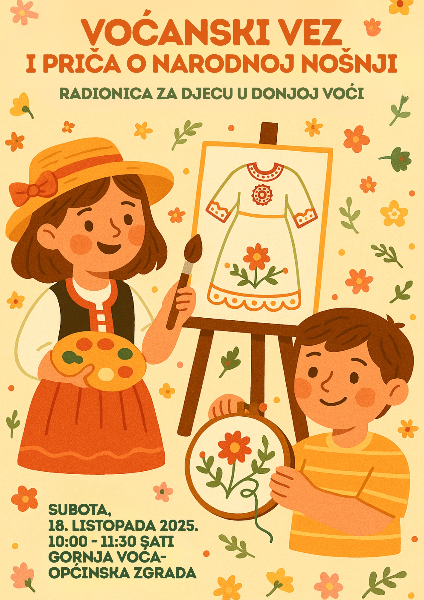 Radionica “Voćanski vez i priča o narodnoj nošnji” povezuje djecu s bogatom tradicijom voćanskog kraja. Kroz igru, razgovor i likovno stvaranje, mali će sudionici upoznati uzorke, motive i boje narodnih nošnji koji prenose priču o radu, zajedništvu i ponosu ljudi Donje Voće.