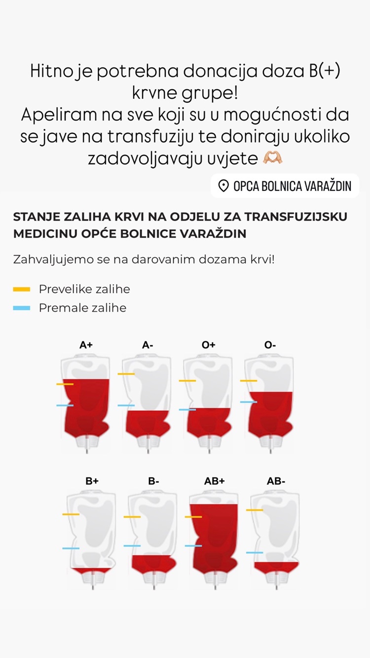 Opća bolnica Varaždin uputila je hitan apel građanima zbog ozbiljne nestašice krvne grupe B RhD pozitivna, uzrokovane povećanom potrošnjom u proteklim danima.
