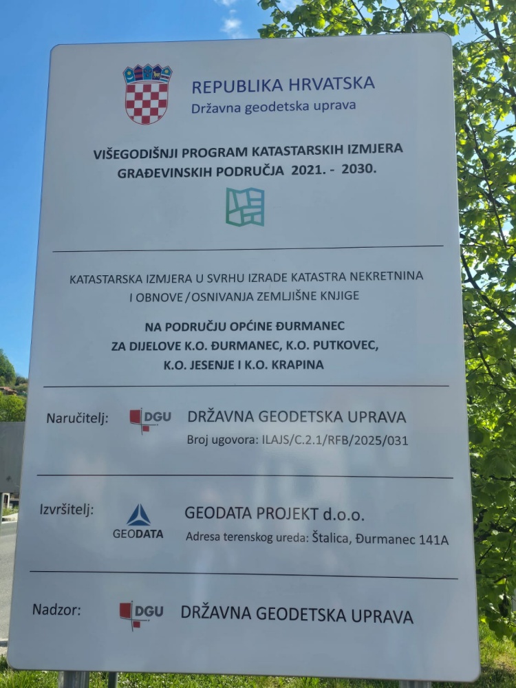U okviru provedbe Višegodišnjeg programa katastarskih izmjera građevinskih područja za razdoblje 2021. – 2030. u utorak, 21. travnja 2026. godine, službeno su započeli radovi na katastarskim izmjerama na području Općine Đurmanec, i to za dijelove katastarskih općina Đurmanec, Putkovec, Jesenje i Krapina.
